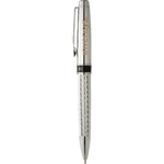Exclusive Luxe design features intricate diamond etched pattern emblazoned on bottom barrel with shiny chrome upper barrel to expertly frame company logos. Twist action mechanism. Pen includes premium black ink cartridge.